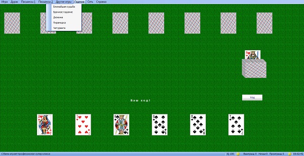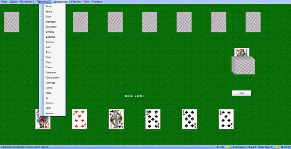 Уникальная бесплатная коллекция карточных игр для детей и взрослых. В коллекции содержится семейные, народные, азартные, карточные игры, а также пасьянсы, фокусы и гадания. Игра не требует установки на компьютер и специальных познаний или знаний правил игры, достаточно скачать игру и начать играть, тем более, что программа не требовательна к ресурсам компьютера. Немало важная фишка - это голосовое сопровождение и расширенная справочная система. Впрочем возможностей у этой игры очень много, поэтому я всего лишь кратко рассказал об игре.
