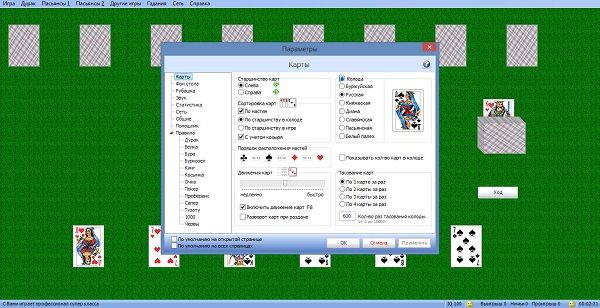7 колод для игры: русская, буржуйская, диана, княжеская, славянская, пасьянсная, белый палех